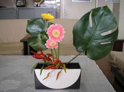 今日、3年生の教科「日本語」における華道で生けた花を校長室にもってきてくれました。B組の女子の作品で、クラスでもよく生けられたものだそうです。