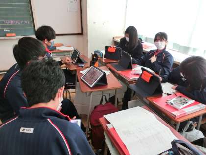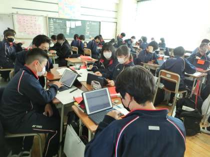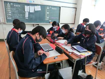 2年生の国語。ディベートの授業。様々なテーマについて班で話し合って考えています。私もいくつか質問されました。