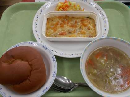 3月11日の給食 公開日 2022/03/11 更新日 2022/03/11 給食 グラタンはベシャメルソースを牛乳ではなく豆乳で作っているので見た目よりもあっさりとしていて食べやすい味になっています。 今日の献立 ・ココアパン ・ジャガイモの豆乳グラタン ・コーンサラダ ・麦入り野菜スープ 食材産地【生鮮食品】 玉ねぎ:北海道 人参:千葉 じゃがいも:鹿児島 キャベツ:愛知 もやし:栃木 セロリ:福岡 鶏肉:岩手 いいね(0)