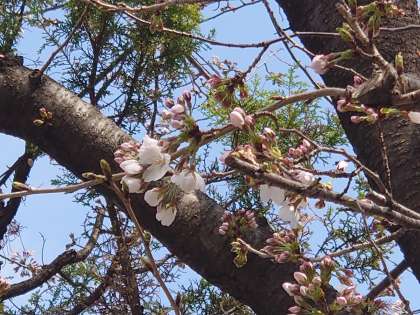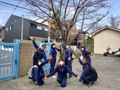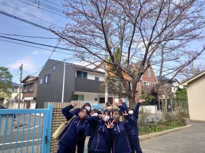 吹奏楽部は、午前中の練習が終わって帰るところでした。桜の下でハイポーズ。