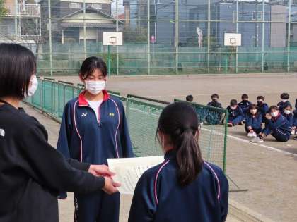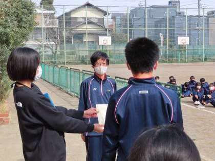 1年生球技大会10 3月23日(水) 公開日 2022/03/24 更新日 2022/03/24 校長室より 表彰式。 総合優勝は1年C組でした。 実行委員の皆さん、みんなのために企画・運営本当にご苦労様でした。 1年生全員が楽しめる企画になったのではないでしょうか。 私も楽しんでいる笑顔の1年生、一生懸命頑張る1年生を見ていて、ほっこりしました。 ありがとう。 中学生になったら、「自主・自律自立・自治」が大事な力です。まさに、この力を発揮できた時間でしたね。 いいね(0)
