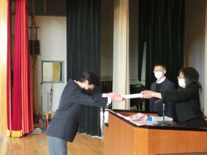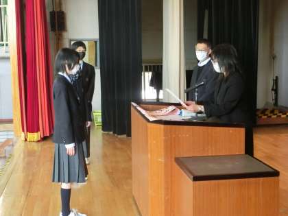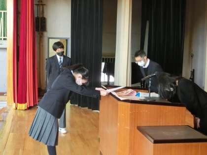 まずは、修了証授与式です。代表の生徒が舞台に上がりました。校長先生より、修了証を受け取りました。1年生。2年生、I組の順番でもらいました。