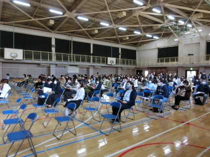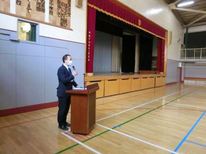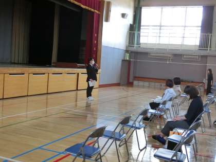 校長あいさつ、教務・生活・進路・保健の順番で担当の先生に話をしてもらいました。