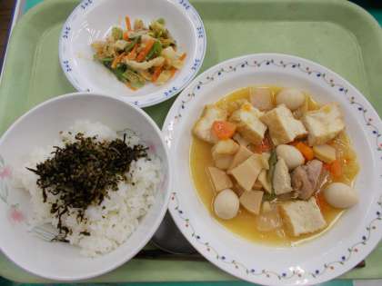 4月22日の給食 公開日 2022/04/22 更新日 2022/04/22 給食 春野菜のうま煮には「新たけのこ」と新玉ねぎや人参を使用しています。 今日の献立 ・ごはん ・ひじきのふりかけ ・春野菜のうま煮 ・野菜のゴマみそ和え 食材産地【生鮮食品】 生姜:高知 人参:徳島 じゃがいも:北海道 玉ねぎ:佐賀 キャベツ:愛知 さやいんげん:沖縄 小松菜:茨城 じゃこ:広島 鶏肉:岩手 たけのこ:熊本 いいね(0)