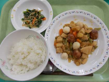 端午の節句では柏餅が有名ですが、カツオやタケノコなども縁起物として食べられています。今日は、カツオの揚げ煮に一口大の揚げたカツオ、煮物の野菜としてたけのこを使用しています。