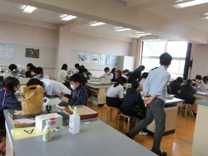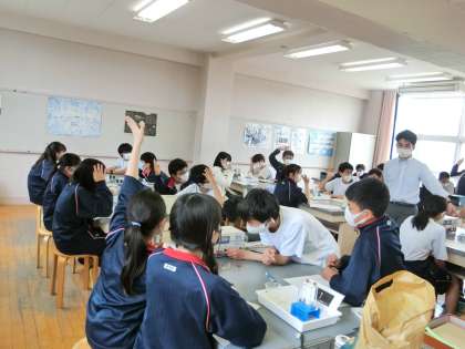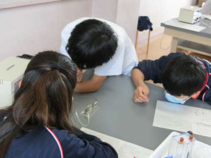 理科室。実験準備中。豆電球の明かりがつかない(汗)