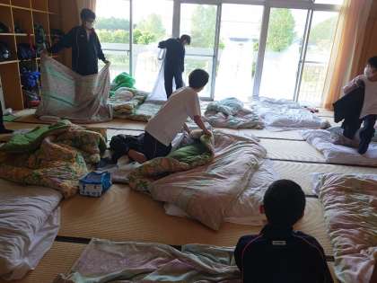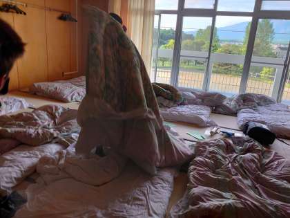 朝の放送とともに目覚め、身支度を整えて、います。まだ寝坊助さんもいますか?だんだん富士山が顔を出してきています。