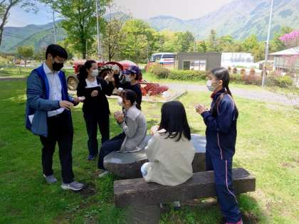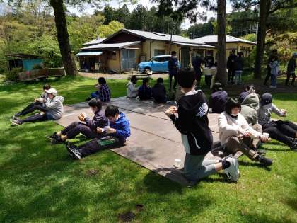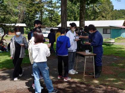 パンと牛乳をもらって、自分で作ったバターをつけて食べました。