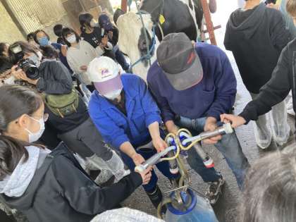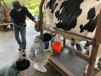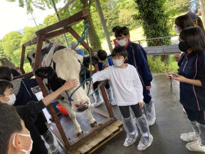 AB組の牧場体験です。牛さんへのお世話、搾乳体験がんばりました。