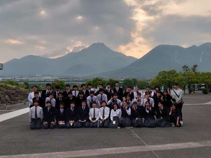 学習を終えて、普賢岳をバックにクラス写真。ハイポーズ。