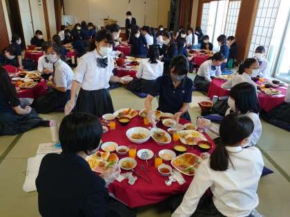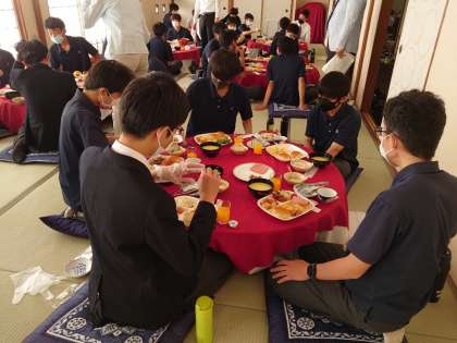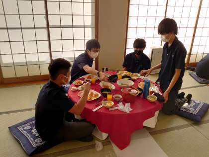 朝食を自分のお皿に取り分けます。手際よく、協力しながら分けてます。