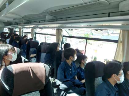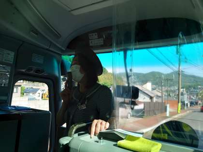 長崎市内をバスで見ながら、バスガイドさんのお話しを聞いています。