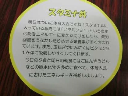 明日のために給食はスタミナ丼。食べながら、あまりの豪雨と雷でびっくりしました。急きょ、準備ができなくなってしまったので、部活動や委員会の人は、明日少し早く登校して準備をお願いします。