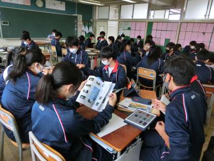 3年生は、2年生に発表することも考えて、どんな発表にするかグループで協力しています。