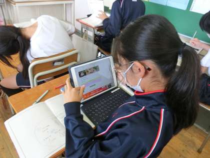 1年生国語の授業。ちらしづくりに取り組んでいます。ロイロノートで提出です。
