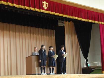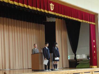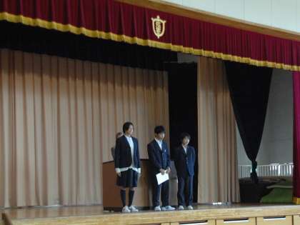 11月16日(水)、体育館において全校朝礼が行われました。校長先生からは「合同発表会」「3年生の面接練習」「映画監督の話」を通して、「自信をもって表現できる何かをもつこと」「常に思いっきり取り組むこと」の大切さについてお話がありました。自分にできることを精一杯積み重ね、自信もって表現できるものを見つけてほしいと思います。