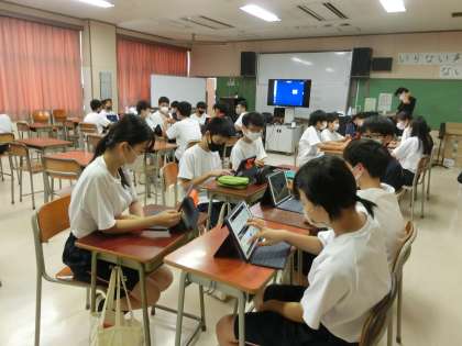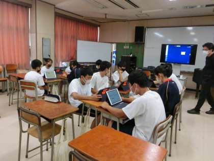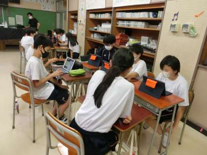 音楽の授業は「ロイロノート」を使って、発表中です。