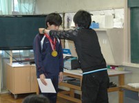また、帰校後に教室で表彰式を行いました。全員が大会の感想を発表した後、先生から賞状とメダルを授与されました。生徒たちの笑顔は、達成感でメダル以上に輝いていました。