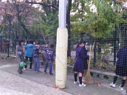 今週弦巻小、松丘小の児童と本校の生徒が一緒にそれぞれの小学校で落ち葉はきをしています。写真は松丘小学校での様子です。小学生と一緒によく頑張っています。