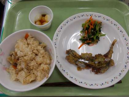 秋を感じる行事が続くので、給食でも秋の食材が入った混ぜご飯を提供しています。