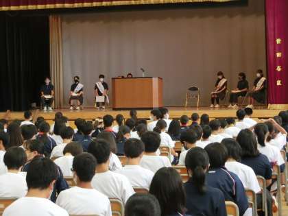 立候補者、応援者とともに、1・2年生は体育館、3年生は教室でオンライン配信でのハイブリッド方式で行いました。