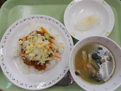 9月15日の給食 公開日 2022/09/15 更新日 2022/09/15 給食 今日の梨はあきづきという品種です。 梨は弥生時代にはすでに食べられていたとされる日本に古くからある果物の一つです。 今日の献立 ・タコライス ・マカロニスープ ・梨 食材産地【生鮮食品】 キャベツ:群馬 人参:北海道 にんにく:青森 セロリ:長野 玉ねぎ:北海道 小松菜:茨城 豚肉:群馬 梨:熊本 いいね(0)