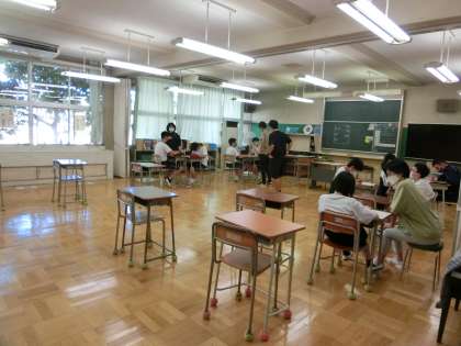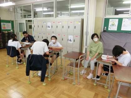 I組は係・委員会の話し合い、2年生は職場インタビューの準備を各訪問先グループに分かれてすすめていました。