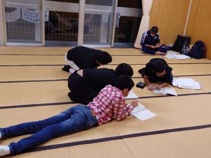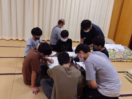 就寝前の班会議で今日の反省と健康チェック。もうすぐ就寝時間です。