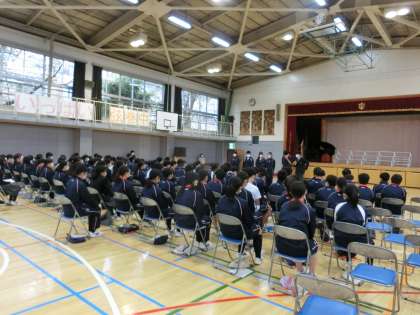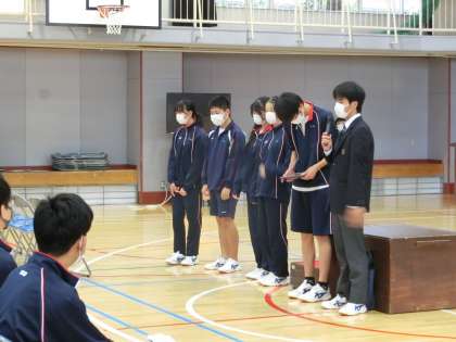 合唱コンクール第1回3年学年練習1 10月17日(月) 公開日 2022/10/17 更新日 2022/10/17 校長室より 今日から合唱コンクールに向けて、特別時程がはじまります。 今までは、音楽の授業で歌ってきましたが、学級での取り組みになります。スタートの今日は、1・2時間目3年生の学年練習でした。実行委員が中心となって学年練習を進めてくれました。まずは、自分の座席から、舞台にあがる動きのデモストレーションをしてくれました。 いいね(0)