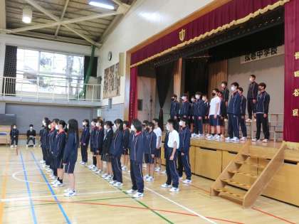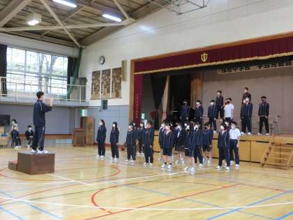 動きの確認をした後、いよいよ課題曲と自由曲の発表です。他のクラス前で合唱を披露するのははじめてです。ドキドキですね。まずは、B組の合唱でした。