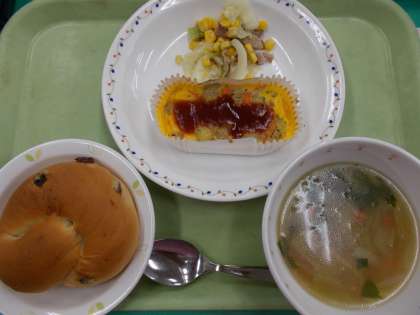 スペイン風オムレツは豚ひき肉・玉ねぎ・人参を炒めたものと蒸したじゃがいもが入っています。上にかかっているソースはケチャップ・赤ワイン・中濃ソース・砂糖を煮詰めたソースになっています。