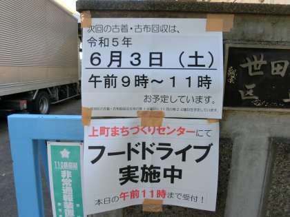 弦巻町会の古着回収のために、弦巻中を使うことになりました。大きなトラックの荷台が、地域の方々の古着回収で、いっぱいになるそうです。ご苦労様です。