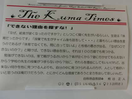 1年生の廊下に毎日掲示している「くま タイム」いいこと書いてあるな〜。ぜひ読んでみてください。言われなくても読んでいますよね。