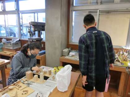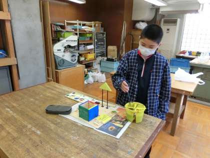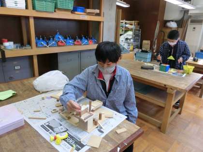 I組は、美術の授業で頑張っています。木片を組み合わせて、建物づくり。
