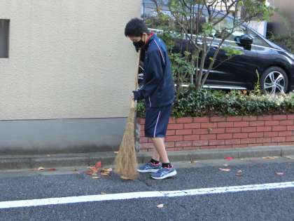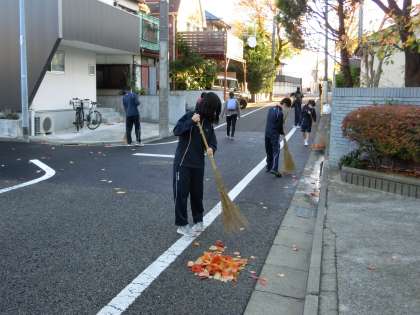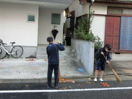 学校の周辺だけでなく、前のお家の落ち葉もはきましょう
