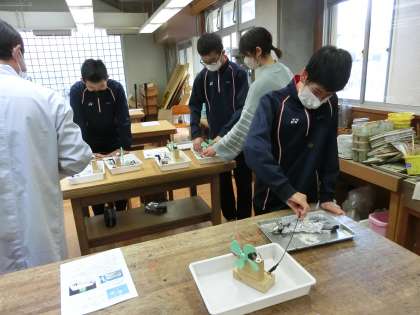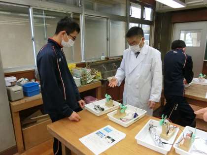 I組では、教育総合センターの科学実験教室の先生にきていただき、電池をつくる実験に挑戦しましたb。