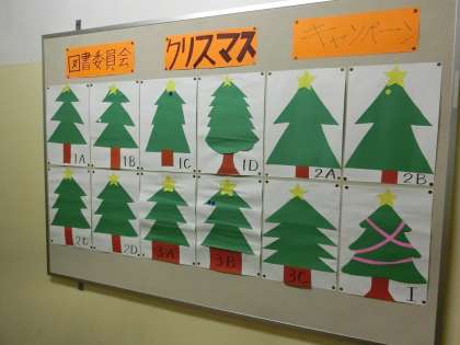 図書キャンペーン1 12月13日(火) 公開日 2022/12/13 更新日 2022/12/13 校長室より 図書委員が考えたキャンペーンがはじまりました。本を読んでクラスのツリーにシールを貼りましょう。どのクラスがたくさんシールが貼られるかな? いいね(0)