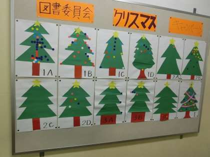 弦中生活7 12月20日(火) 公開日 2022/12/21 更新日 2022/12/21 校長室より 図書委員のキャンペーン。クラスマスツリーをシールで飾ろう。 今のところ1年A組独走中。 他のクラスも頑張ろう。2位は??? いいね(0)