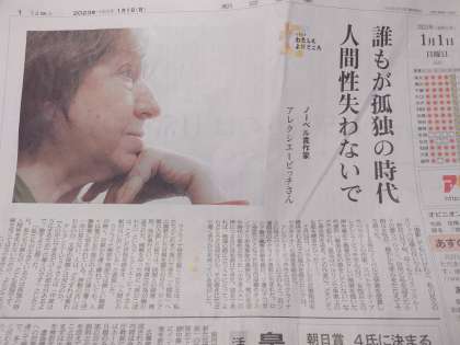 さて、元旦の朝日新聞の一面は、ノーベル賞作家アルクシエービッチさんのインタビュー記事でした。彼女は、2015年にノーベル文学賞を受賞しました。女性兵士の声を集めて戦場の生々しい現実を描いた代表作「戦争は女の顔をしていない」で知られていて、現在はベルリンで亡命生活を送っているそうです。