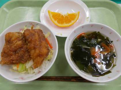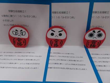 2月になり、受験もいよいよ本番の時期になります。受験生応援メニューとして「勝負に勝つ」のかつ丼と「いい予感」のいよかんを提供しました。