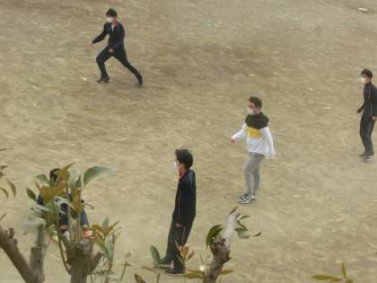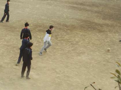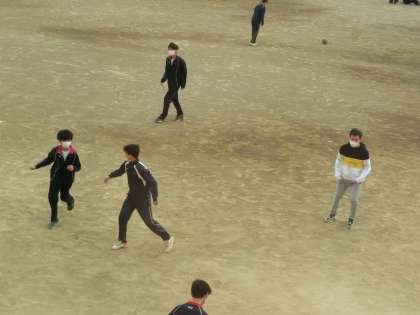 ALTの先生も一緒に広い校庭でサッカーを楽しんでいます。