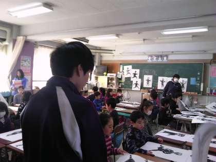 3年生の版画の授業でお手伝いをしています。