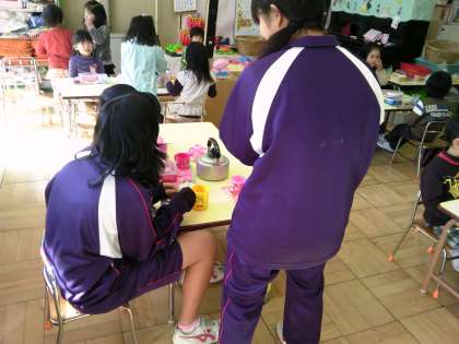園児たちと一緒にお弁当を食べるところです。他の生徒たちもみんな楽しそうです。