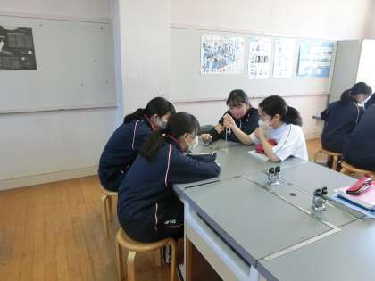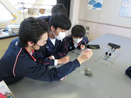 3年生、受験前で人数は少ないですが、理科・実験中。