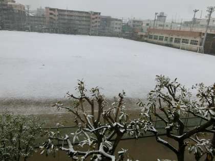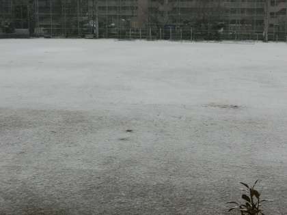 雪が降りはじめ、あっという間に校庭が真っ白になりました。午後は雨模様になりました。