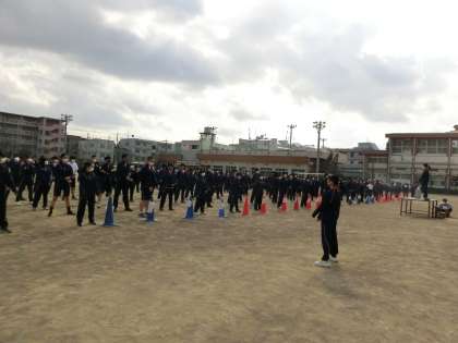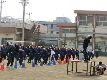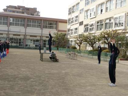大縄跳びの前の準備体操。ラジオ体操もしました。