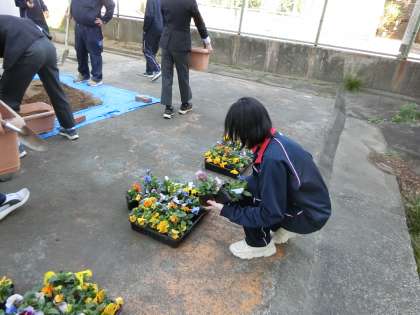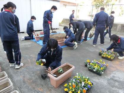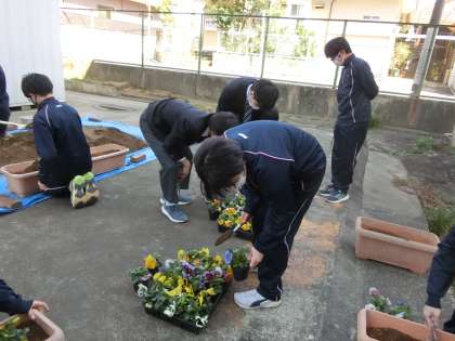 ボランティア活動1 3月14日(火) 公開日 2023/03/14 更新日 2023/03/14 校長室より 弦巻町会の皆さんからいただいたパンジーの苗をプランターに植え替えるボランティアを募集したところ多数の参加がありました。 12年生は昼休み、3年生は放課後の時間を使って植え替えをしました。 いいね(0)