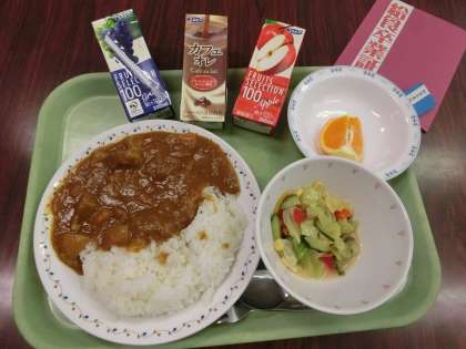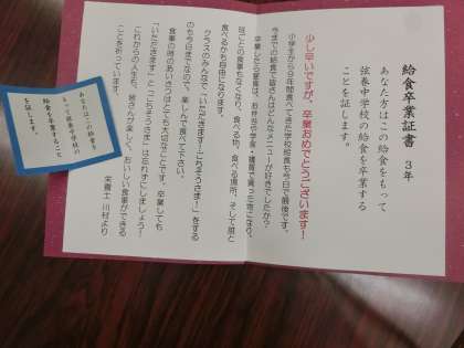 義務教育9年間最後の給食です。弦巻中のカレーの味を忘れないでね。