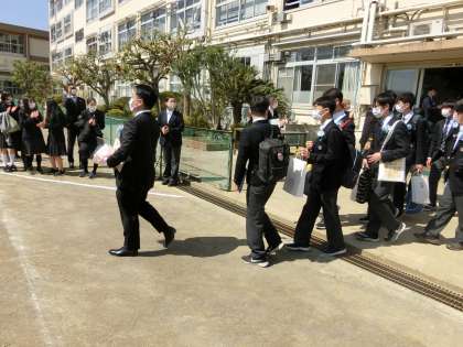 生徒代表から花束と色紙を受け取った担任の先生を先頭に!!