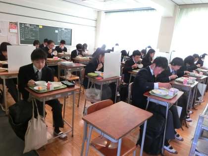 パーテーションなし、黙食もしなくても良い給食です。みんなが大好きなカレーライス。1年生は中学校生活はじめての給食。たくさん食べてくださいね。